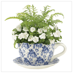 Create your own storybook garden scene with this fanciful planter! An exact replica of a fine china tea set, right down to the ladylike floral pattern; just add a plentiful plant and enjoy. Drain hole in bottom. Weight 6.6 lbs. Dolomite. Plant not included. Tea cup planter: 13" x 10" x 6 3/4" high; saucer: 12 3/8" diameter. Set.