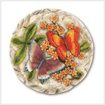 A pair of vivid butterflies frolics amongst lush foliage, enlivening a bas-relief stepping stone with glowing colors and romantic sentiment. Sure to be the crowning jewel of your garden. Cement. 11" diameter x 1" thick.