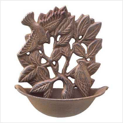 Nostalgic styling abounds in this quaint wall-mounted pocket holder, finished in weathered auburn and crowned with a leafy bird-and-branch bas-relief. A perfect decorative cradle for birdseed, water, or even a tiny tender plant; it adds a gently sentimental touch! Iron. 6 1/2" x 3 1/4" x 7 1/2" high.