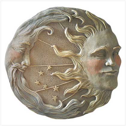 Intricate details lend astral glory to this starry stone-look moon and sun plaque. Polyresin. 11" x 1" x 10 1/2" high.