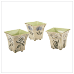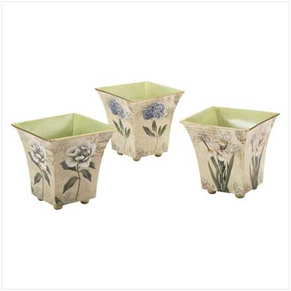 Nested flower print tin pots are painted in a classic countrified style for the botanical touch that\'s welcomed in any home. 5 1/2" x 5 1/2" x 5" high.