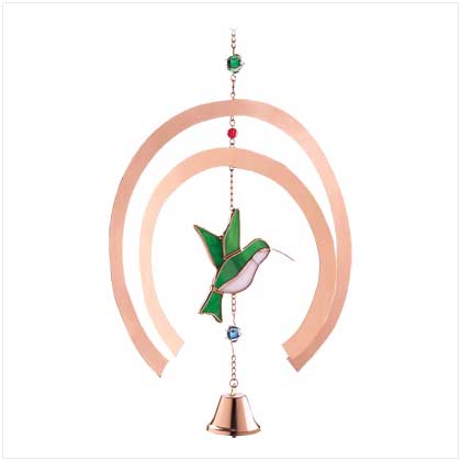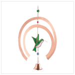 Gleaming copper arcs turn sunlight into a mesmerizing play of light and form, while a stained glass hummingbird and tinkling bell add musical motion. An absolutely enchanting outdoor accent! Hook for hanging. Weight 0.3 lb. Glass and metal. 10 3/4" x 2" x 11" high.