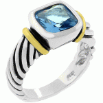 Designer-Inspired Cable Shank Ring in Two Tone Bezel Handsetting Featuring a Cross Cushion Cut Aqua CZ is White Gold Rhodium Bonded.. The Aqua Cable Ring will melt your heart the second it reaches your finger tip. It has a dazzling Aqua CZ held up by a silvertone cable shank between two thin gold bands. Oxidation brings out its brilliance. Get your hands on all the colors! White Gold Rhodium Bond is achieved using an electroplating process that coats the item with heavy layers of rhodium, a close cousin of platinum that costs three times as much, which gives our jewelry a platinum luster. 14k Bonded Gold is achieved using an electroplating process that coats the item with heavy layers of 18k Yellow Gold and color-treated to a perfect 14k Hamilton gold color. - Base Metal: Lead Free Alloy