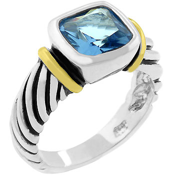 Designer-Inspired Cable Shank Ring in Two Tone Bezel Handsetting Featuring a Cross Cushion Cut Aqua CZ is White Gold Rhodium Bonded.. The Aqua Cable Ring will melt your heart the second it reaches your finger tip. It has a dazzling Aqua CZ held up by a silvertone cable shank between two thin gold bands. Oxidation brings out its brilliance. Get your hands on all the colors! White Gold Rhodium Bond is achieved using an electroplating process that coats the item with heavy layers of rhodium, a close cousin of platinum that costs three times as much, which gives our jewelry a platinum luster. 14k Bonded Gold is achieved using an electroplating process that coats the item with heavy layers of 18k Yellow Gold and color-treated to a perfect 14k Hamilton gold color. - Base Metal: Lead Free Alloy