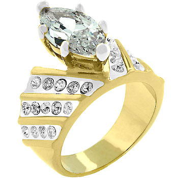 Marquis Cut Centerpiece in Prong Setting with Channel Set Round CZ in tutone 18k Gold and Rhodium.. \This symmetrical pattern of bold CZs encompass a brilliant Marquis cut stone. This intricate formula of patterns make for a truly beautiful design. This ring is stunning on any occasion.\" - Base Metal: Lead Free Alloy