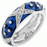 White Gold Rhodium Bonded and Navy Blue Hand Applied Enamel Overlay Eternity Ring with Handset Clear CZ Xs and Silvertone Polk-a-dots. Doesn\'t this ring make you wanna party? Navy Blue Enamel and silvertone dots and Xs with Clear CZs POPing like a strobe light on a silvertone eternity band. Our Boogie Down series is fun and full of color. White Gold Rhodium Bond is achieved using an electroplating process that coats the item with heavy layers of rhodium, a close cousin of platinum that costs three times as much, which gives our jewelry a platinum luster. - Base Metal: Lead Free Alloy
