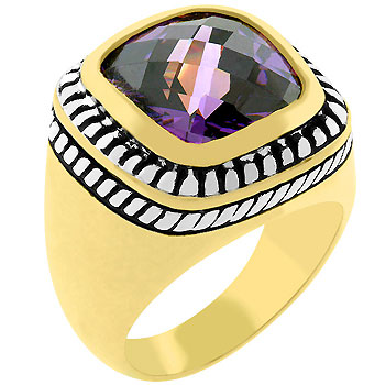 14k Gold and White Gold Rhodium Bonded Fashion Ring Featuring Bezel Set Amethyst Cushion Cut CZ and Cable Style Accents Bordering It in Goldtone and Silvertone. Faceted Amethyst Ring features two tones of 14k gold and white gold rhodium bonding. Its amethyst CZ centerpiece is quite radiant. Excellent quality too! White Gold Rhodium Bond is achieved using an electroplating process that coats the item with heavy layers of rhodium, a close cousin of platinum that costs three times as much, which gives our jewelry a platinum luster. 14k Bonded Gold is achieved using an electroplating process that coats the item with heavy layers of 18k Yellow Gold and color-treated to a perfect 14k Hamilton gold color. - Base Metal: Lead Free Alloy