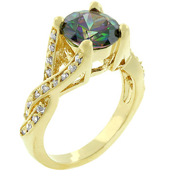 14k Gold Bonded Cocktail Ring with a Large Mystic Color Stone and Small Clear CZ\'s Accents along its Shoulders in an Overlay Pattern to Four Points of the Round Stone. Fall in a trance with the gorgeous Mystique center stone on this beautiful cocktail ring. The overlaid lines of CZ will leave you hypnotized to it\'s beauty. 14k Bonded Gold is achieved using an electroplating process that coats the item with heavy layers of 18k Yellow Gold and color-treated to a perfect 14k Hamilton Gold Color. - Base Metal: Lead Free Alloy
