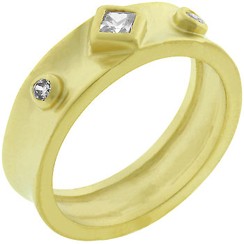 14k Sanded Matte Gold Bonded 3 Stone Ring Featuring Bezel Set Princess and Round Cut Clear CZ in Goldtone. Golden Princess will look so cute on your finger Adorned with 3 stones bezel set and finished with matte 14k gold. All your friends will be asking \Where did you get that? 14k Bonded Matte Gold is achieved using an electroplating process that coats the item with heavy layers of 18k Yellow Gold and color-treated to a perfect 14k Hamilton gold color. - Base Metal: Lead Free Alloy