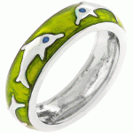 White Gold Rhodium Bonded Leaping Silvertone Dolphins and Apple Green Enamel Eternity Ring in Silvertone. Cozumel Dolphin Ring is designed with apple green color enamel and silver tone accented dolphins. Inspired by a dolphin\'s playfulness just before a Cozumel sunset, its a very cute addition to our enamel collection and hopefully yours! White Gold Rhodium Bond is achieved using an electroplating process that coats the item with heavy layers of rhodium, a close cousin of platinum that costs three times as much, which gives our jewelry a platinum luster. - Base Metal: Lead Free Alloy