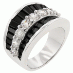 White Gold Rhodium Bonded Contemporary Ring with Clear and Jet Black CZ in Silvertone. Itza features two rows of jet black CZ baguettes that border a row of clear CZ and set in a lustrous silver tone. White Gold Rhodium Bond is achieved using an electroplating process that coats the item with heavy layers of rhodium a close cousin of platinum that costs three times as much which gives our jewelry a platinum luster. - Base Metal: Lead Free Alloy