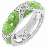 White Gold Rhodium Bonded and Hand Applied Light Green Enamel Overlay Eternity Ring with Handset Clear CZ Xs and Silvertone Polk-a-dots. Doesn\'t this ring make you wanna party? Light Green Enamel and silvertone dots and Xs with Clear CZs POPing like a strobe light on a silvertone eternity band. Our Boogie Down series is fun and full of color. White Gold Rhodium Bond is achieved using an electroplating process that coats the item with heavy layers of rhodium, a close cousin of platinum that costs three times as much, which gives our jewelry a platinum luster. - Base Metal: Lead Free Alloy