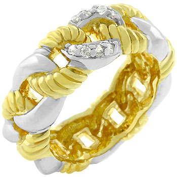14k Gold and White Gold Rhodium Bonded Eternity Ring with an Interwoven Twisted Link and Cable Design and a Single Pave \O\" in Tutone. Linked by Love is crafted in two tone 14k gold tone and rhodium eternity ring featuring alternated links of twisted \"O\" shapes. The gold tone links are cabled while the rhodium tone links are polished leaving one pave CZ \"O\" that sparkles like the stars. 14k Bonded Gold is achieved using an electroplating process that coats the item with heavy layers of 18k Yellow Gold and color-treated to a perfect 14k Hamilton gold color. White Gold Rhodium Bond is achieved using an electroplating process that coats the item with heavy layers of rhodium a close cousin of platinum that costs three times as much which gives our jewelry a platinum luster. White Gold Rhodium Bond is achieved using an electroplating process that coats the item with heavy layers of rhodium a close cousin of platinum that costs three times as much which gives this piece a platinum luster. 14k Bonded Gold is achieved using an electroplating process that coats the item with heavy layers of 18k Yellow Gold color-treated to a perfect 14k Hamilton gold color. - Base Metal: Lead Free Alloy