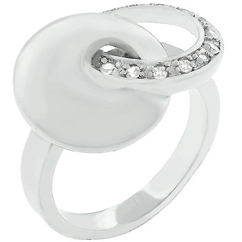 White Gold Rhodium Bonded Ring with Pave CZ Circle Silhouette Interlinked with a Filled Silvertone Circle in Silvertone. Opposites do attract and it\'s a beautiful thing. Make a bold statement with this silver tone circle interlinked with a CZ circle and attract all the looks! White Gold Rhodium Bond is achieved using an electroplating process that coats the item with heavy layers of rhodium, a close cousin of platinum that costs three times as much, which gives our jewelry a platinum luster. - Base Metal: Lead Free Alloy
