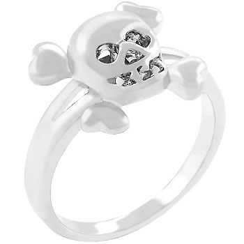 White Gold Rhodium Bonded Skull and Cross Bone Ring with 3 Round Cut Clear CZ in Silvertone. Show off your rebel side with the Skull and Cross Bone Ring featuring a silver tone skull with 3 round cut clear CZ and crossing bones underneath. This ring will have everyone talking. White Gold Rhodium Bond is achieved using an electroplating process that coats the item with heavy layers of rhodium, a close cousin of platinum that costs three times as much, which gives our jewelry a platinum luster. - Base Metal: Lead Free Alloy