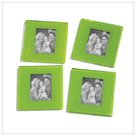 These unique coasters do double duty as frames for 2 1/2" x 13/4" photos. Each coaster is 3 1/2" in diameter. What a fun conversation starter! Green glass.