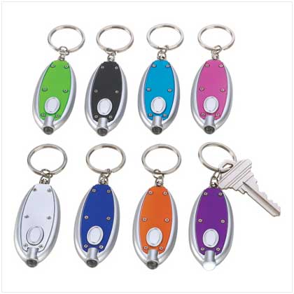 No more fumbling in the dark; these handy keychain lights keep shadows at bay! Easy one-hand operation lights up a super-bright LED with just a gentle squeeze; sleek, colorful case designs dress up your keys. Set of 8 in assorted colors. Weight 0.2 lb. Plastics with metal key ring. 3V lithium battery included. Sold in a pack of 8. Each is 3 3/4" x 1 x 1/4" thick.