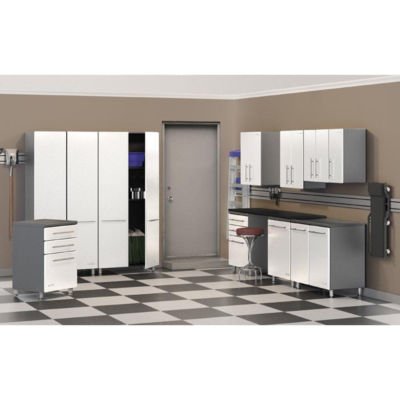 Product Code : GA-100KSW-PROMO Super System 12-piece kit offers infinite design options and over-sized storage space to meet all your needs like no other cabinet line in the marketplace. Cabinet designed with garage strength and styled for "Endless Possibilities" for use in virtually any room of the home or business with unique Star-fire Pearl color, radius cabinet profile and much more. Promotional Cabinet kit offers a great mix of our most popular cabinets that include; 1-Two Door Base Cabinet, 1-One Door Base Cabinet, 2-Three Drawer Base Cabinets, 2-Two Door Tall Cabinets, 1-Three Door Partitioned Wall Cabinet, 3-Two Door Tall Cabinets, 1-Worktop Bench Surface and 1-Set of 4" Rolling/Locking Casters. Cabinet features strong 3/4" RTA cabinet construction, oversized storage capacity, 3/4" shelves with 100 lb load rating, fully adjustable Euro hardware, ball bearing drawer glides for smooth operation, Brushed Chrome cabinet handles, designer style adjustable feet for uneven surfaces, easy assembly and much more. Great for use in; Garage, Laundry, Basement, Utility, Home Office, etc. Color: Star-fire Pearl color on cabinet fronts and Grey elsewhere.