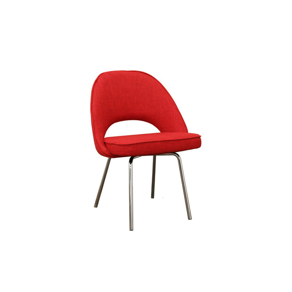 Product Code : DC-665 Evocative of the styles and principles of mid-century design, the Executive Side Chair fits well with both other mid-century styles and the ultra contemporary designs of today. This versatile dining chair or accent chair is made with sturdy steel legs black non-marking feet, foam cushioning, and multi-hued red twill upholstery. Some assembly is required. Product dimensions: 22.75"W x 17.7"D x 31.4"H; Shipping Dimensions: 24"L x 21"W x 20"H . -Mid century modern accent chair