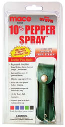 Attractive MACE PEPPER SPRAY LEATHERETTE MODELS fit easily in a pocket or purse. Features glow-in-the-dark locking safety cap and keyring. 11 gram stream unit sprays up to 10 feet. Contains 5 one second bursts. Available in five fashionable colors: red, black, blue, purple and green. Includes key ring.