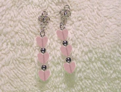 This product is a pair of brand new 'Sterling Silver Rose Quartz Hearts Dangle Earrings' made in the U.S.A. The weight of these dangles are approximately 5 grams of metal each with beads, and are made from a hand wrought scroll dome filigree, two- 5 millimeter round sterling beads, and three- 8 millimeter natural rose quartz heart beads. The earrings are 1-3/4 inch in length and 5/8 inch wide, and the complex finding dangle is securely attached to the post back filigree stud for use with butterfly backs. The 'Rose Quartz Hearts Dangles' are very shiny and bright and look like platinum, as they are protected with a precious rhodium onlay over solid sterling silver to prevent tarnish..."a very high end show venue display quality finish". In addition, this item has been sterilized with jeweler solution and sealed in a plastic bag. This first class product came from a designer showcase as an original concept and will retain its' brilliance for a long time. Shipping, Insurance, and Signature Confirmation are additional to the final bid price. The buyer pays shipping, handling, and insurance. Payment is via PayPal Only. No Returns Or Refunds.JANUARY 1st, 2013Your Click Thru Tells Us What To Do.