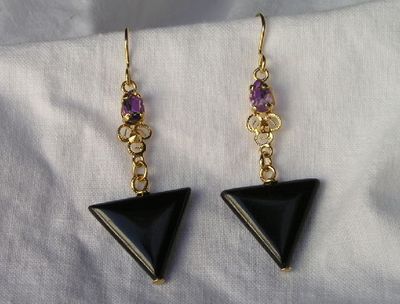 This product is a pair of brand new 'Sterling Vermeil Amethyst Onyx Filigree Dangle Earrings' made in the U.S.A. The weight of these dangles are approximately 2 grams of metal each and gemstones. They are made from a filigree framework stone setting, triangle cut polished black onyx, and a 6 by 4 millimeter pear cut genuine faceted amethyst. The earrings are 1-3/4 inches in length and 3/4 inch wide; they each have the complex assembly connected together with soldered jump rings and go into the ear lobe with open kidney wires. The 'Filigree Dangle' is very shiny and bright as it has been protected with a hard 14K gold plating to add real gold and to prevent the sterling silver from tarnish..."a very high end show venue display quality finish". This is real 'VERMEIL STERLING SILVER'. In addition, this item has been sterilized with jeweler solution and sealed in a plastic bag. This first class product came from a designer showcase as an original concept and will retain its' brilliance for a long time. Shipping, Insurance, and Signature Confirmation are additional to the final bid price. The buyer pays shipping, handling, and insurance. Payment is via PayPal Only. No Returns Or Refunds.JANUARY 1st, 2013Your Click Thru Tells Us What To Do.