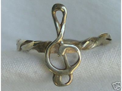 This item is a brand new “Sterling Silver Musical G-Cleff Ring” made in the U.S.A. It is designed as a solid sterling silver twisted wire cast shank with a simple 'G-Cleff' design. The face of the ring is 1/2” top to bottom and 1/4" in width, it has a thin style shank that is 1/8" wide under the finger. The weight of this ring is approximately 1.45 grams of metal, and it is a high quality sterling silver casting. This item is available in ring size 6 only. This ring may be altered, adjusted or sized; it is very shiny and bright and looks like platinum..."a very high end show venue display quality finish". In addition, this item has been sterilized with jeweler's solution and sealed in a plastic bag. This first class product came from a designer showcase as an original concept and will retain its' brilliance for a long time.