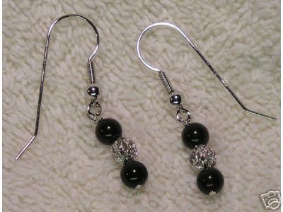 This product is a pair of brand new “Sterling Silver Onyx Ball Filigree Bead Dangles” made in the U.S.A. The weight of these dangles are approximately 4 grams of metal each with beads, and are made from one- round 7 millimeter sterling filigree ball bead, and two- 7 millimeter natural black onyx beads. The complex finding dangle is securely attached to a bead with twist wire fish hook style earwire. The earrings are1-1/2" in length and 3/8" wide. The 'Onyx Filigree Bead Dangles' are very shiny and bright as they been protected with a precious rhodium onlay over solid sterling silver to prevent tarnish; they are very shiny and bright and looks like platinum..."a very high end show venue display quality finish". In addition, this item has been sterilized with jeweler's solution and sealed in a plastic bag. This first class product came from a designer showcase as an original concept and will retain its' brilliance for a long time.