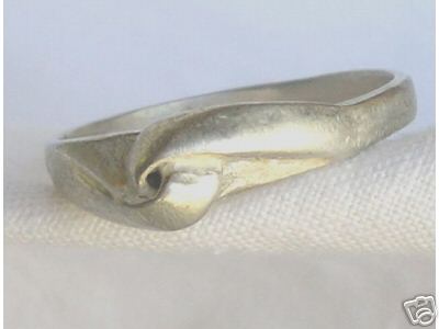 This item is a brand new “Sterling Silver Ribbon Ring” made in the U.S.A. It is designed as a solid sterling silver cast shank with a simple 'Ribbon' design. The face of the ring is 3/8” from top to bottom and 5/8" in width, it has a thin style shank that tapers to 1/8" wide under the finger. The weight of this ring is approximately 2.14 grams of metal, and it is a high quality sterling silver casting. This item is available in ring size 7 only. This ring may be altered, adjusted or sized; it is very shiny and bright and looks like platinum..."a very high end show venue display quality finish". In addition, this item has been sterilized with jeweler's solution and sealed in a plastic bag. This first class product came from a designer showcase as an original concept and will retain its' brilliance for a long time.