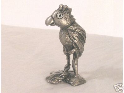 This item is a miniature “Genuine Pewter Parrot On Branch Animal Figurine”. It is a brand new made in the U.S.A. decorative curio cabinet collectible. It is composed of 92%+ tin metal as required for 'Genuine Pewter' quality standards. It weighs 1.1 ounces, stands 2” tall, and is 1" deep by 1” wide at the base when sitting on the shelf. The item has a silvery textured highly detailed body and it appears that the parrot is listening before it talks to you. The eyes are black enamel, and the antique satin look of the figurine reveals the quality of the craftsmanship. This product is part of a limited collection by the same artist.