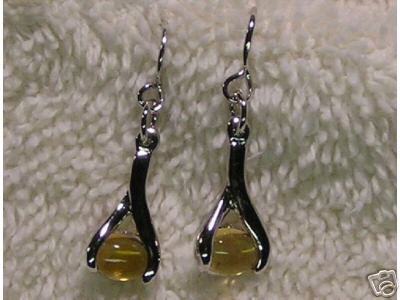 This item is a pair of brand new “Sterling Silver Citrine Wishbone Dangle Earrings” made in the U.S.A. The design is a simple wishbone style gemstone setting with a 7 X 5 millimeter cabochon faceted natural citrine; the gemstones have good color and clean clarity. The weight of these earrings are approximately 3 grams of metal, and are good quality sterling silver castings. The dangle earrings are 1-1/4" in height by 3/8" wide by 3/16" deep; they each have the wishbone connected with soldered jump rings to open kidney wires which go into the ear lobe. The 'Wishbone Earrings' are very shiny and bright and look like platinum, as they are protected with a precious rhodium onlay over solid sterling silver to prevent tarnish..."a very high end show venue display quality finish". In addition, this item has been sterilized with jeweler's solution and sealed in a plastic bag. This first class product came from a designer showcase as an original concept and will retain its' brilliance for a long time.
