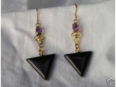 This product is a pair of brand new “Sterling Vermeil Amethyst Onyx Filigree Dangle Earrings” made in the U.S.A. The weight of these dangles are approximately 2 grams of metal each and gemstones. They are made from a filigree framework stone setting, triangle cut polished black onyx, and a 6 X 4 millimeter pear cut genuine faceted amethyst. The earrings are 1-3/4" in length and 3/4" wide; they each have the complex assembly connected together with soldered jump rings and go into the ear lobe with open kidney wires. The 'Filigree Dangle' is very shiny and bright as it has been protected with a hard 14K gold plating to add real gold and to prevent the sterling silver from tarnish..."a very high end show venue display quality finish". This is real 'VERMEIL STERLING SILVER'. In addition, this item has been sterilized with jeweler's solution and sealed in a plastic bag. This first class product came from a designer showcase as an original concept and will retain its' brilliance for a long time.