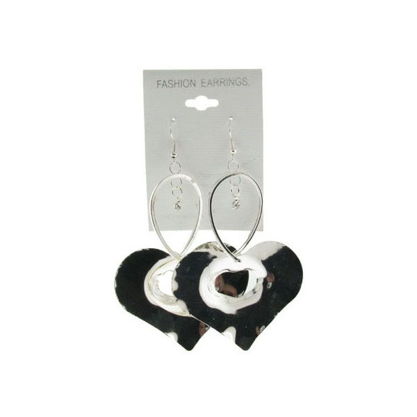 Silvertone french hook earrings with Silvertone pierced heart dangles and rhinestone accents; individually carded and poly bagged. Case Pack 60