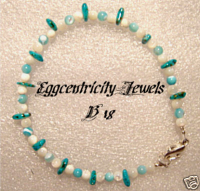 This bracelet is a beautiful bit of history. It combines Mother-of-Pearl beads that were cut and dyed in the early 1950s in Japan with Murano Glass beads. The Murano beads are flat and look like dark blue opals and the Mother-of-Pearl gemstone beads are 4 mm in diameter.