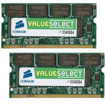 4GB Kit (2GB x 2) Value Select series PC-5300 (667MHz) SODIMM, Unbuffered, 5-5-5-15, 128M x 8, 200-pin... Designed for current generation notebooks and mini-PCs, Corsair's high density SODIMMs allow users to maximize memory bandwidth and minimize performance bottleneck to deliver superior user experience. The Corsair ValueSelect SODIMMs are optimized for the Microsoft Windows Vista client operating system; Individually tested; Superior hardware design to reduce heat generation.