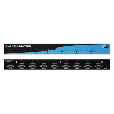 The Gefen 4x4 VGA Matrix offers flexibility and convenience by routing high-quality VGA and analog audio from any of four VGA/audio sources to any of 4 VGA displays and audio devices. The Gefen 4x4 VGA Matrix works with a wide variety of VGA sources such as computers, security cameras and DVRs. Every source is accessible at any time by any display by selecting it with the included IR remote, front panel buttons, or RS-232 control.