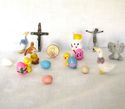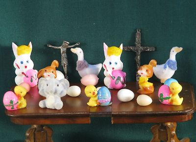 Here are 20 assorted figures with a Spring - Easter Theme about them, cute as can be. Rabbits, flocked geese, a flocked elephant, a metal Christ on Cross and metal Jesus alone and more. These were figures, like the egg stands and findings I also sell, from the days when I created Egg Art or Eggeury with real goose, duck and chicken eggs. Most date from about 1980 or so, some earlier. The figures in this assortment stand ½” - 1-1/2” high. Perfect if you are an Egger or do other crafts requiring small figures, or just have a place to display some really cute figurines.