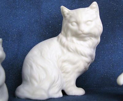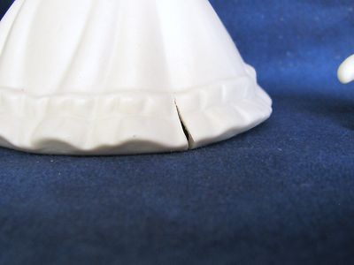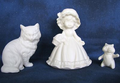 An assortment featuring a cute little girl in colonial garb with a flower basket, 3-¾” tall, a beautiful cat, 2-¾” tall and a cute raccoon, 1-¾” tall. All of luminous porcelain bisque and ready to be china painted and fired or left in their natural white porcelain beauty. The girl has a ‘fire crack’ in the side bottom of her skirt, not a true crack, but a ½” area where the porcelain separated during the firing process. It’s not the kind of crack that can lengthen as a crack from a hard knock would, but I just want you to be aware of this. See the photo.