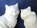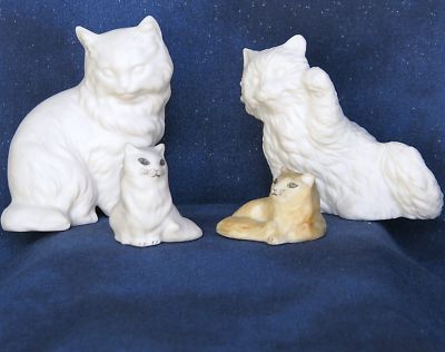 Four porcelain bisque cats, 2 large 3” cats and 2 small 1” felines. One of the small is white plain bisque with painted features, the other small cutie is painted tan with features. So very cute. The large cats could be painted with china paints and fired if desired or left plain to enjoy as is in their naturally pure state.