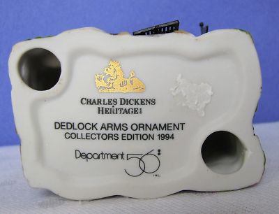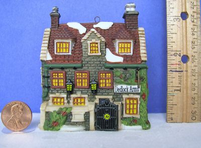 From Department 56, this is a Collectors Edition Ornament of the Deadlock Arms, a miniature, hanging replica of the full sized building manufactured by Dept. 56. From 1994 and part of the Charles Dickens Heritage it is mint in itβs original box, never having been removed until now when I took it out to inspect it and photograph it. The detail is amazing on this hand painted miniature building, well done, not missing any nook or cranny. Measures 3-½β h x 2-7/8β l x 1-7/8β wide. A wonderful addition to your Department 56 collection, your Christmas tree, a charming window scene with other similarly sized buildings or a thoughtful gift for that special someone on your holiday list.