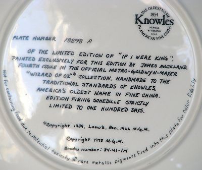 The Wizard of Oz Collectors plate series, 1977 - 1979, was one of the first, if not THE first plate series commemorating a motion picture. The last plate issue coincided with the 40th anniversary of ‘The Wizard of Oz” in 1979. The original artwork was created by one James Auckland, whose claim to fame, at least through Google search, seems to be this one series of plates. The plates, produced by the Edwin M. Knowles China, an American company who trademarked the name of one of the countries oldest China producers, are beautiful in appearance and a wonderful addition to any plate lover’s collection and/or “Wizard of Oz” lovers. All plates are in perfect condition, no chips, cracks or repairs, and have been in my collection since their original issue, 31 to 33 years ago.