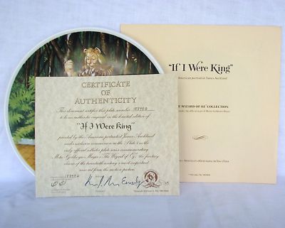 If I Were King is the fourth issue in The Wizard of Oz Collection plate series produced by Knowles China with original artwork by James Auckland and issued in 1978. The plate measures 8-½” in diameter and has it’s certificate of authenticity and original enclosures. In perfect condition, the scene shows The Cowardly Lion as portrayed by Bert Lahr, standing on the Yellow Brick Road, fists up and looking ready to fight, but actually scared out of his wits all the time.