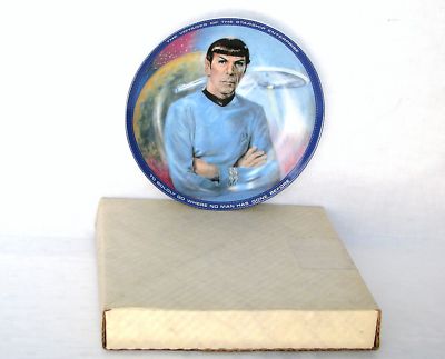 It’s Mr. Spock, Commander, majestically poised with the USS Enterprise soaring in the background. Issued in 1983, this 8-1/2” plate was the first in a Star Trek series with original artwork done by famed plate artist Susie Morton. A beautifully detail work by Ernst Porcelain, the Vulcan is portrayed as he appeared in the original television series of the sixties. It is in its original box. A great addition to the Star Trek fans collection, science fiction aficionado or any plate collector.
