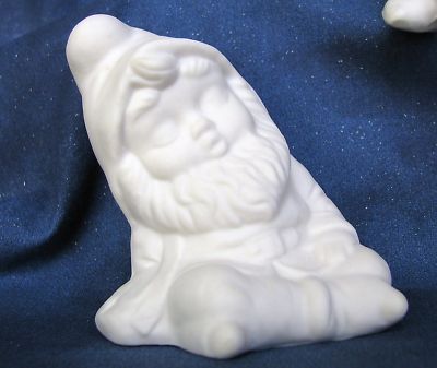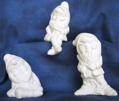 A set of 3 cute as the dickens Gnomes or Elves, however you want to view them. They each measure about 4-½” tall. 2 are standing, the third is in a seated position. Could be painted with Christmas - Holiday motif and be Elves or left equally beautiful as white.
