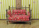 The perfect addition to the spare bedroom, childs room or Florida room, this vintage brass daybed would look charming in any of those places.The bed, made of welded brass, measures 3-7/8” long, 3-1/8” tall and 2-1/2” wide.The set includes a mattress and 3 pillows, all upholstered in a lovely floral pattern material.It could use a good polishing and one of the brass knobs is missing off the back left post, but other than that, it is in very good used condition.It would make a lovely piece for the dollhouse, curio cabinet or what not shelf!