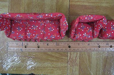 A plush, 4 piece set for your dollhouse living room!Upholstered with a lovely red floral pattern, this vintage set would be the epitome of comfort for your dollhouse family!The couch measures 5” long x 4” high x 2” wide, the chairs, 4” high x 2-3/8: side x 1-3/4” deep and the ottoman 1-3/8” high x 2” long x 1-5/8” wide. Just ask Patrick Stewart, who stands 6” tall what he thinks of the set!A sticker on the bottom of the couch states ‘Taiwan’ and the set is in excellent slightly used condition.T’would make a lovely set for your dollhouse, curio cabinet or what not shelf!