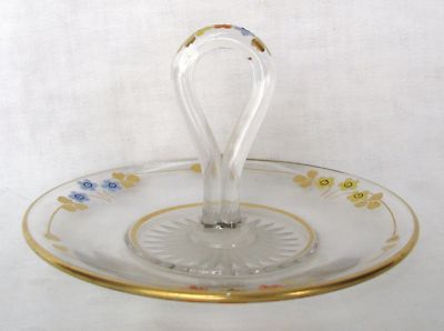 A Westmoreland Glass #1800 Butter Ball serving tray (1800-27) from the 1920’s in crystal with hand painted enameled Forget Me Nots in a different color configuration than I have been able to find. Clustered together in groups of 3 with interconnecting gold ring and leaves as they seem to usually be, these are in 3’s, but the clusters are all one color, not one flower each of a different color. I have been unable to find this decoration in this presentation in any of the catalogs or books that I own. But again, it may be a decoration that was never placed in a catalog, an experimental design never marketed or a decorator more or less ’doodling’ with his enamels. Who knows! But it is one of 5 pieces with this decoration I found over the years and are now for sale. The piece measures 3-1/2” high and is 6” in diameter and is in excellent condition, right down to the gold trim.