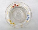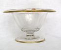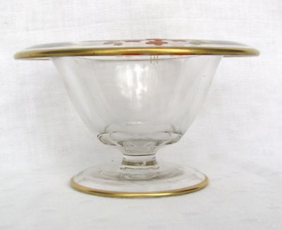 A Westmoreland Glass #1800 Comport/Mayo (1800-59) from the 1920’s in crystal with hand painted enameled Forget Me Nots in a different color configuration than I have been able to find. Clustered together in groups of 3 with interconnecting gold ring and leaves as they seem to usually be, these are in 3’s, but the clusters are all one color, not one flower each of a different color. I have been unable to find this decoration in this presentation in any of the catalogs or books that I own. But again, it may be a decoration that was never placed in a catalog, an experimental design never marketed or a decorator more or less ’doodling’ with his enamels. Who knows! But it is one of 5 pieces with this decoration I found over the years and are now for sale. The piece measures 3-¾” high and is 6-¼” in diameter and is in excellent condition, right down to the gold trim.