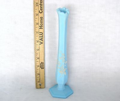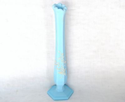 WESTMORELAND GLASS #229 HEXAGONAL FT BUD VASE SOFT MIST ANT. BLUE w/BEADED BOUQ