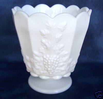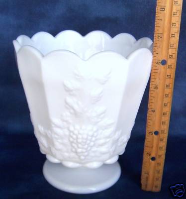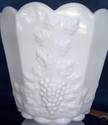 Lovely White Milk Glass footed Jardiniere with straight sides, (PG-43) made by Westmoreland Glass in the #1881 Paneled Grape pattern. It measures 6-1/2” high and is 6” in diameter. It is marked with the “W” superimposed over the “G” and has not been reproduced. I sell only original Westmoreland Glass pieces produced between 1888 and 1984 at the factory in Grapeville, PA.